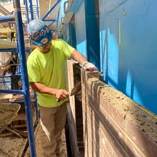 The typical process of any masonry project is to first layout the building as per the Contract plans, find any issues or mistakes in the preplanning process and try to resolve them before it impacts the project schedule. If the job requires back-up CMU, this is installed first followed by all door and window openings, inside corners, and outside corners are detailed with waterproofing materials. After the detail work is completed, the entire substrate is sprayed with an approved Air Vapor Barrier (AVB), including all the metal flashing, copper flashings, caulking at seams and control joints.